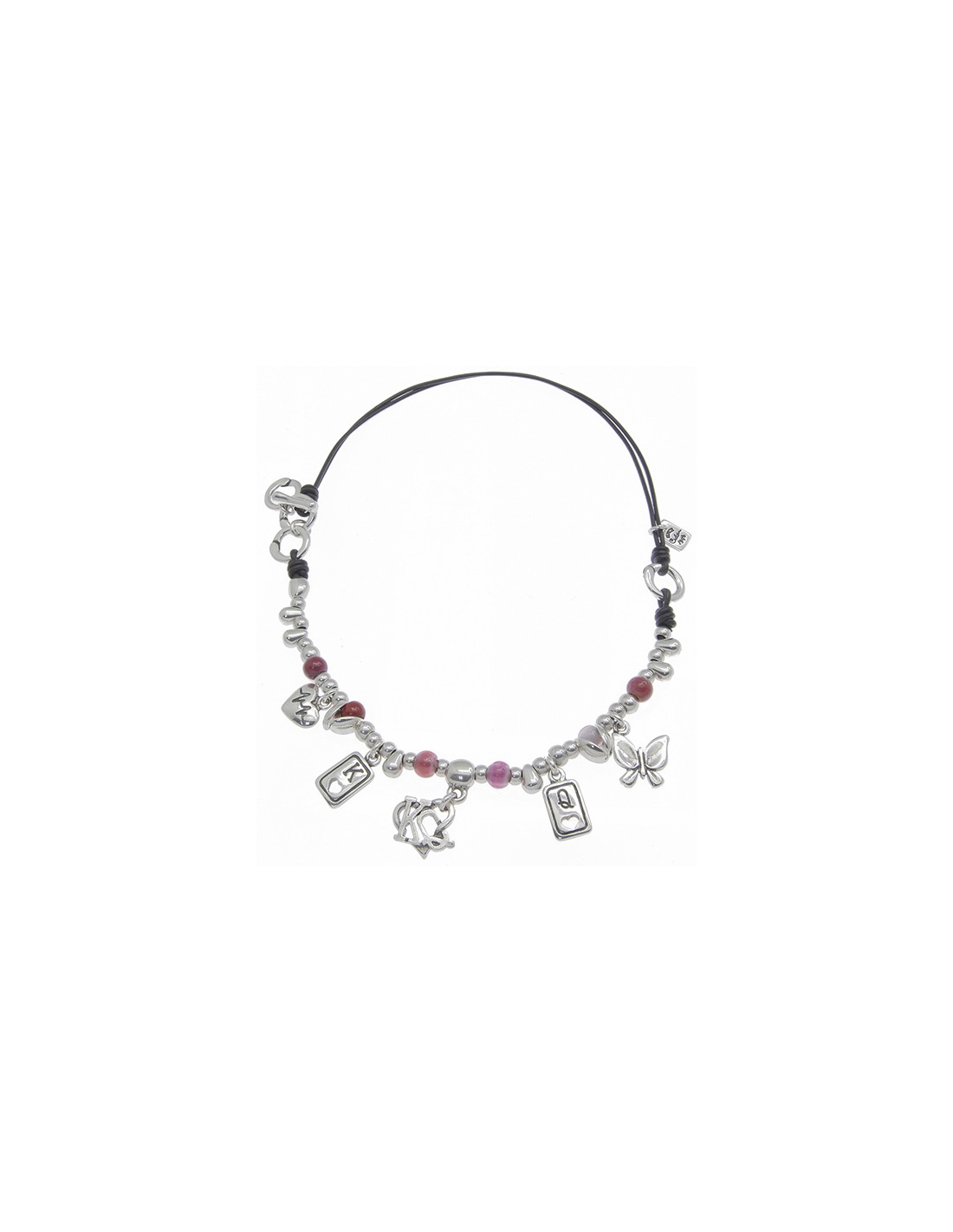Collar corto de cuero negro elaborado a partir de numerosas cuentas y charms bañados en plata y combinadas con cristales artesanales de Murano. Un diseño innovador creado por Ciclón de manera totalmente artesanal en nuestras instalaciones de Madrid. Nuestros controles de calidad en componentes y baños garantizan todas nuestras piezas durante 2 años