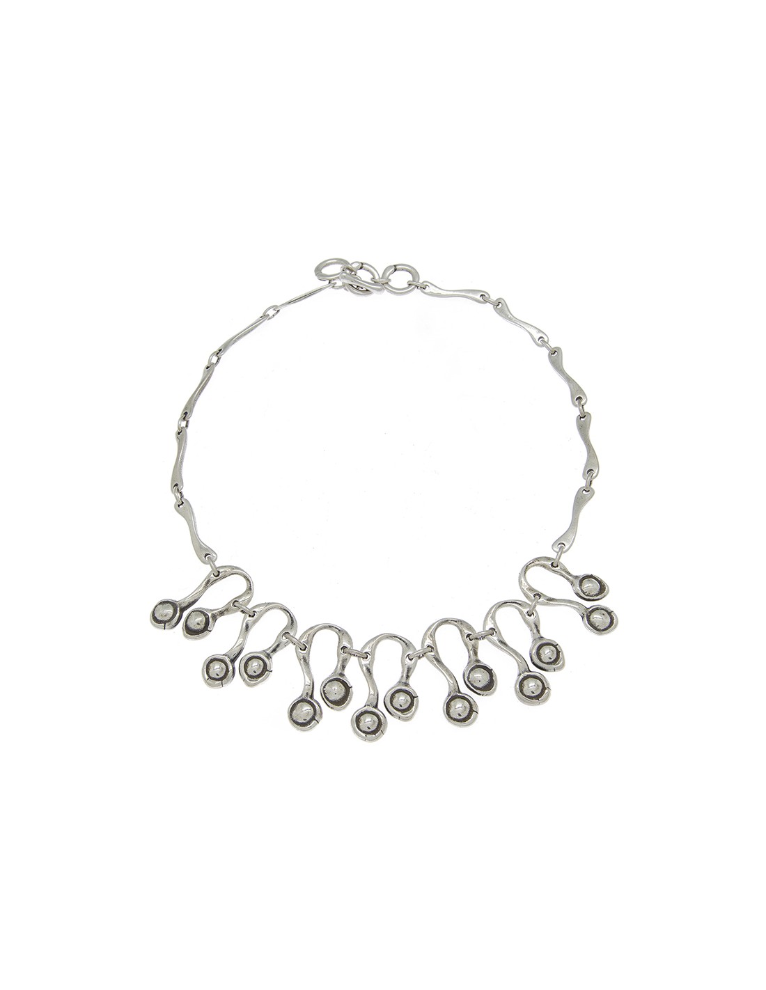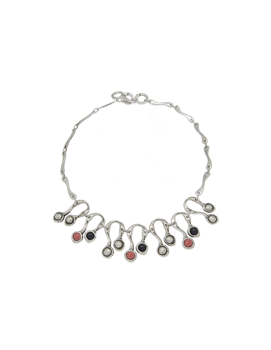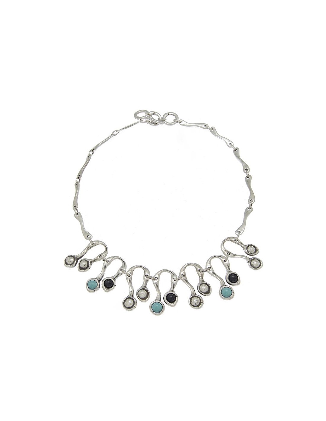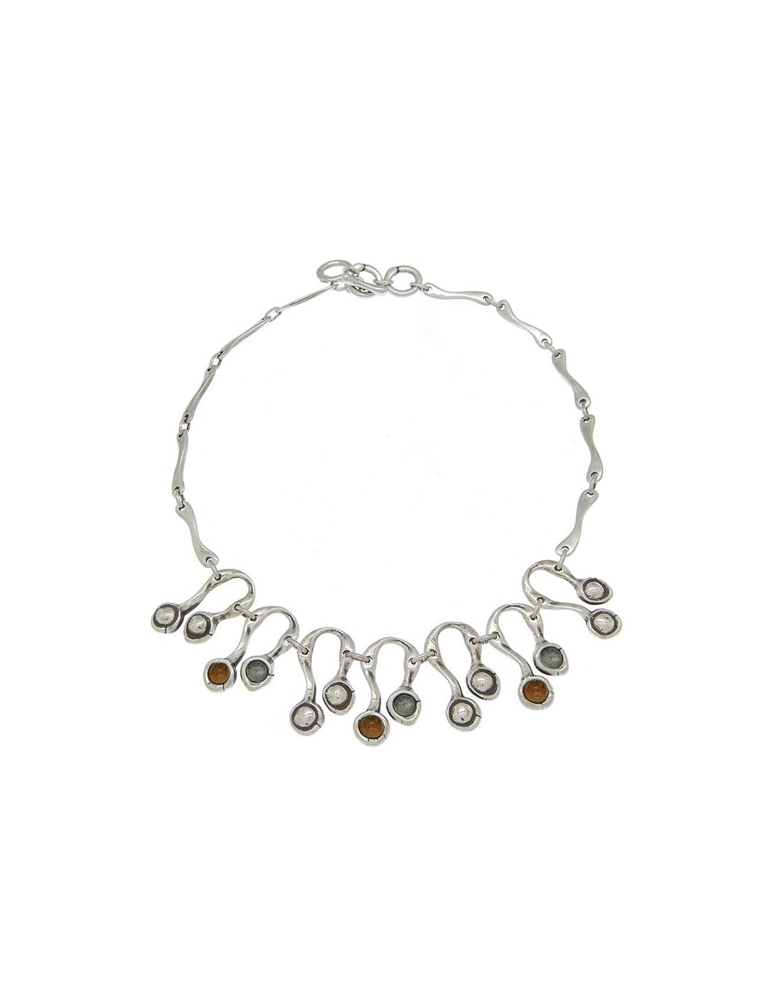 Collar corto de metál elaborado a partir de piezas bañadas en plata combinadas con cristales artesanales de Murano en varios combinaciones de color. Destacando su original composicion en la parte central, un diseño creado por Ciclón de manera totalmente artesanal en nuestras instalaciones de Madrid.