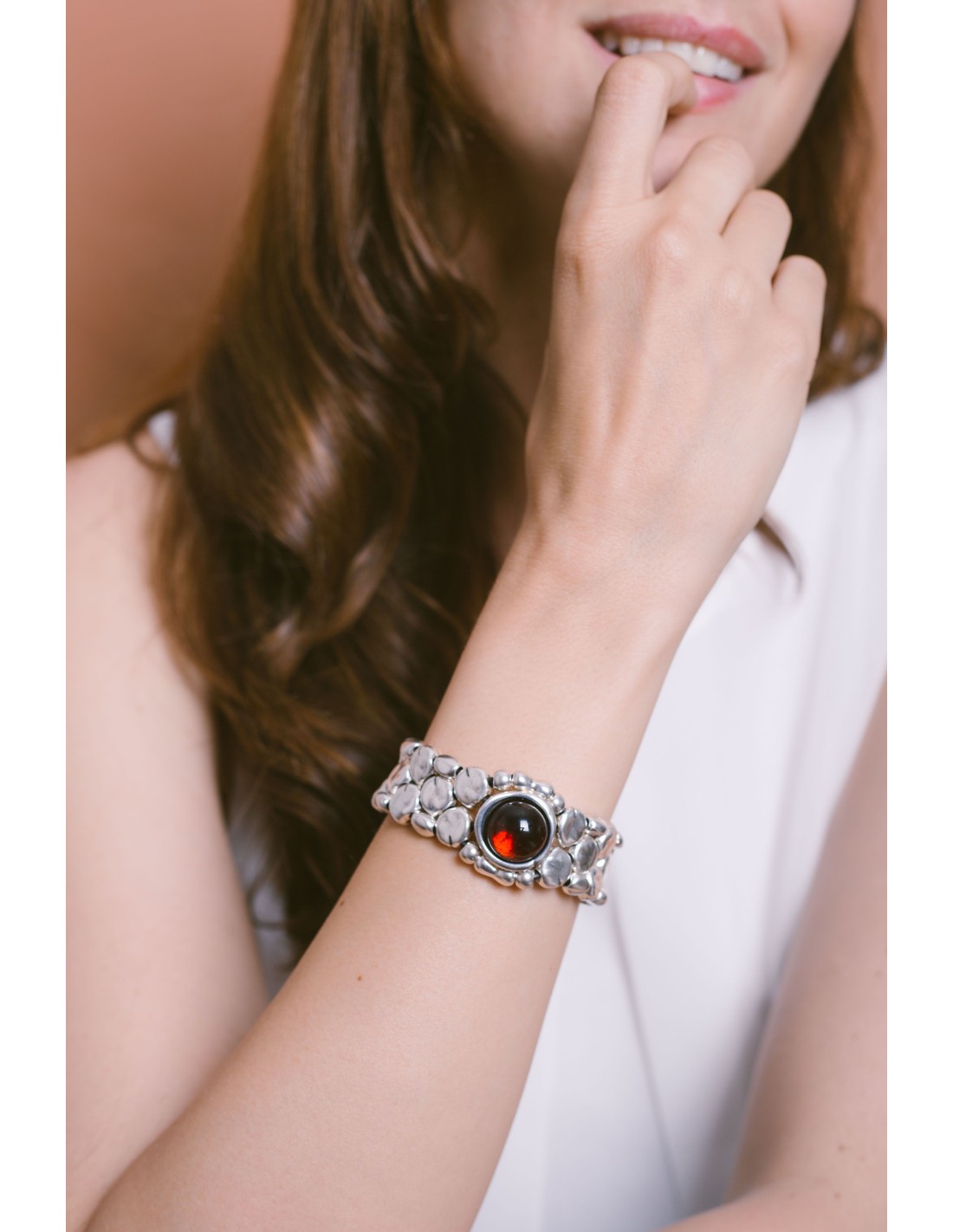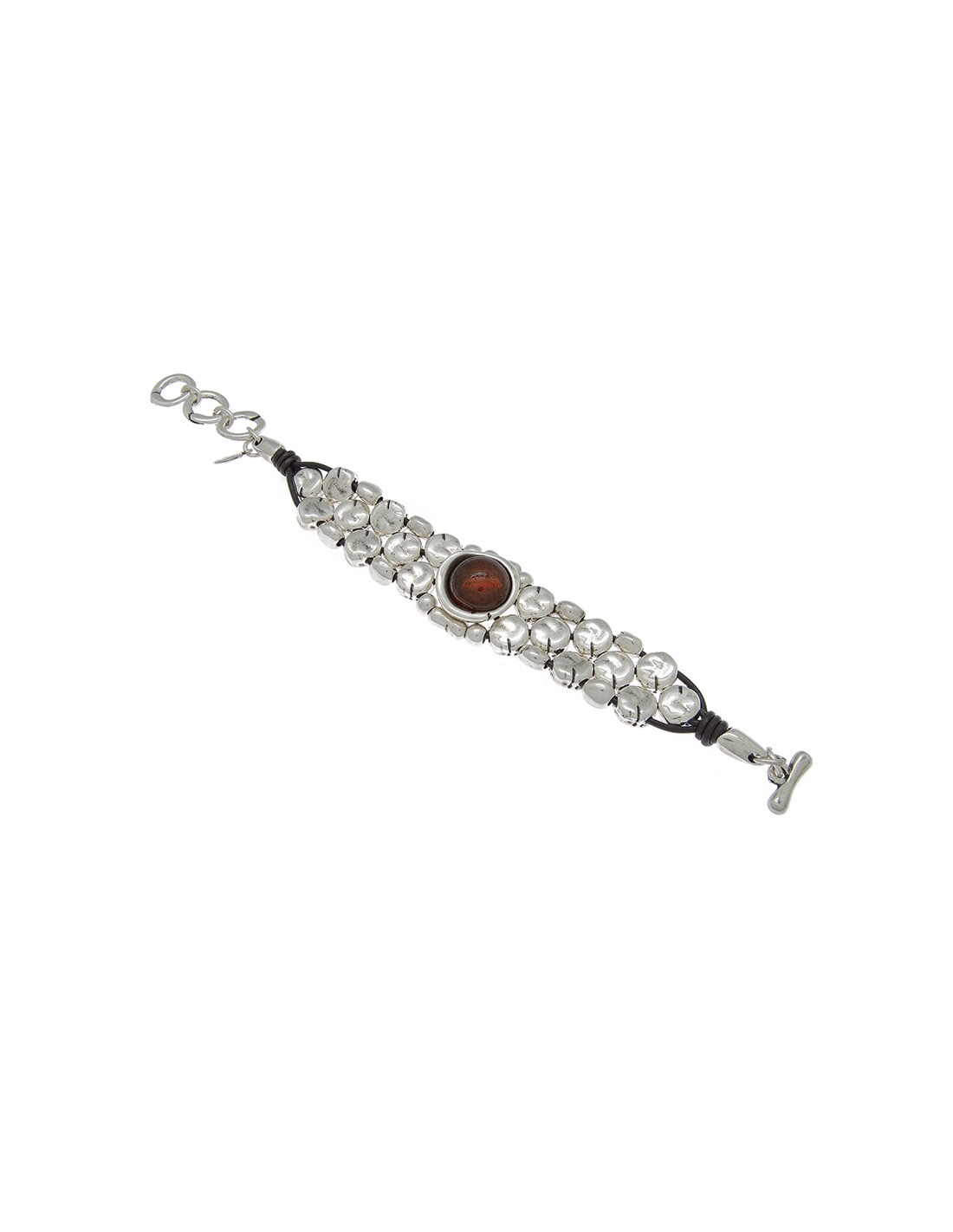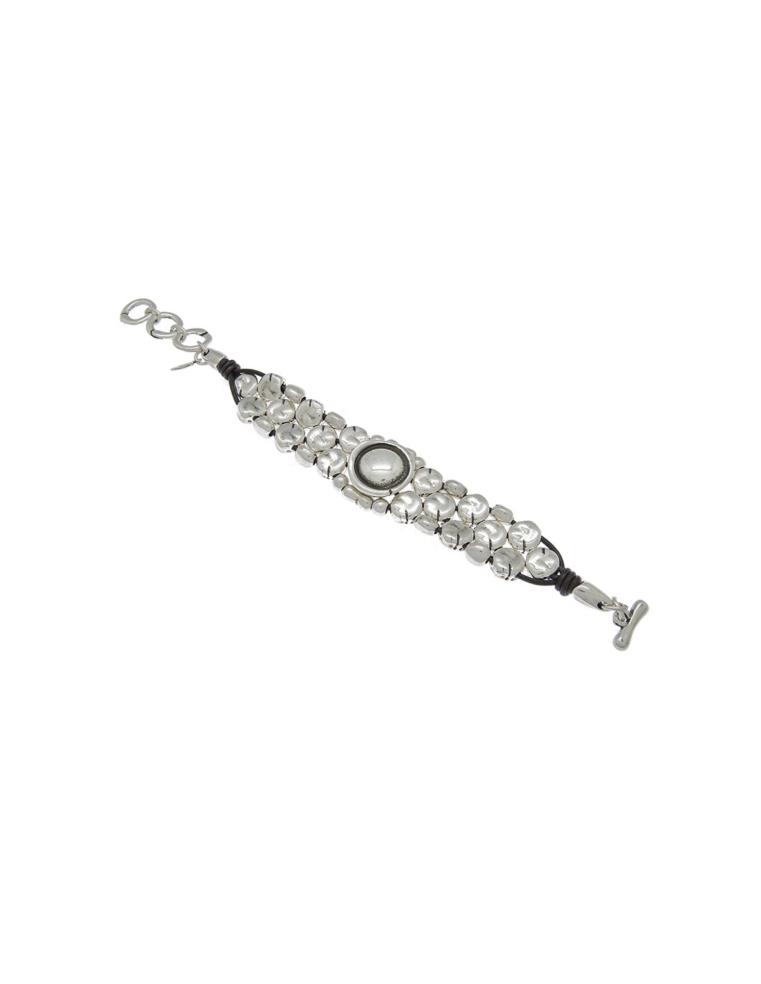Pulsera que combina cordón de cuero con piezas de metal bañadas en plata y cristales naturales de Murano. Una pulsera con un creativo diseño muy característico del estilo de Ciclón, realizado de forma artesanal en nuestras instalaciones de España.