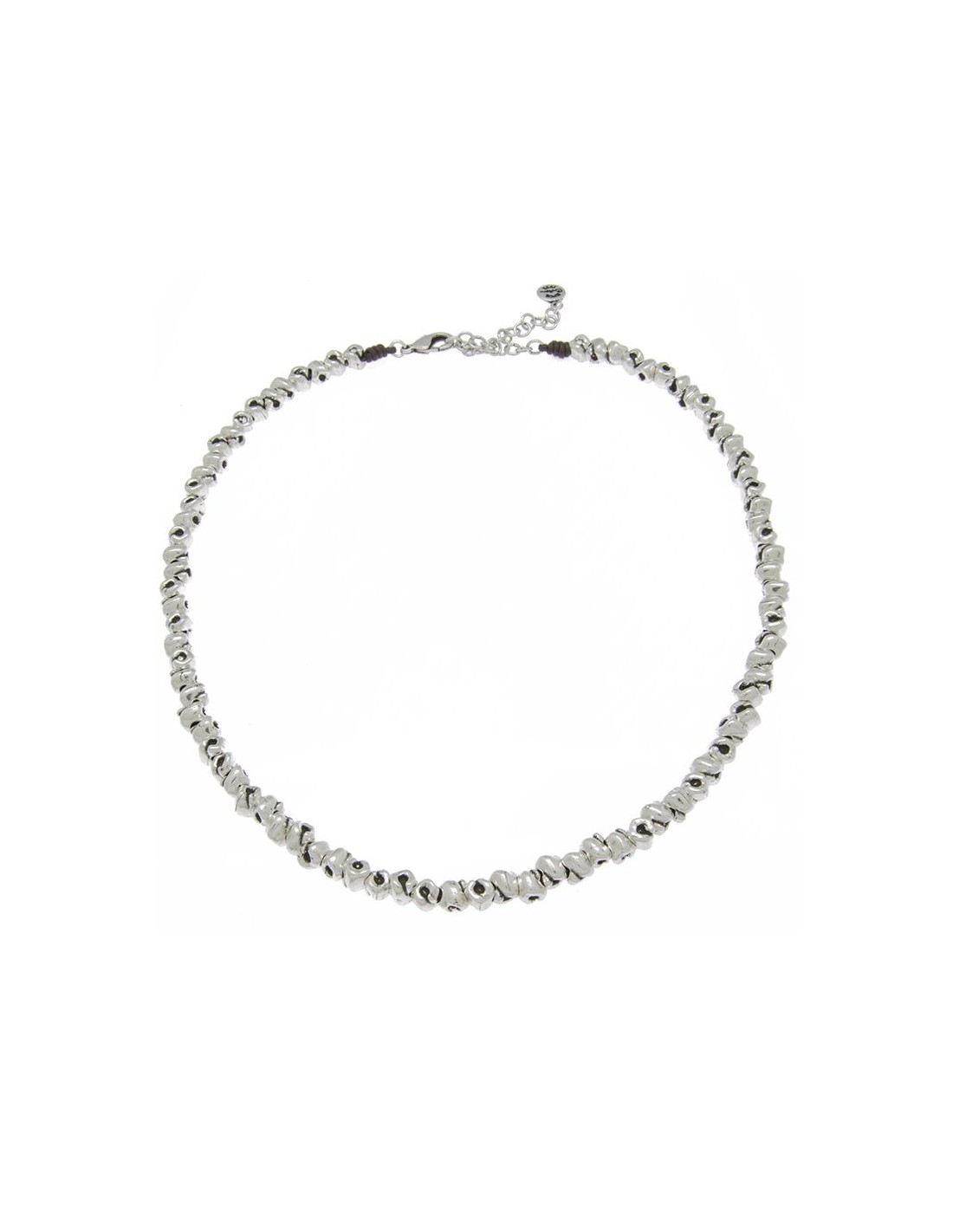 Collar corto de mujer elaborado a partir de cuentas nudo en metal con baño de plata sobre cuero negro . Un diseño sencillo pero original para combinar con cualquier look. Como todas las piezas de la colección ha sido realizado totalmente en España.