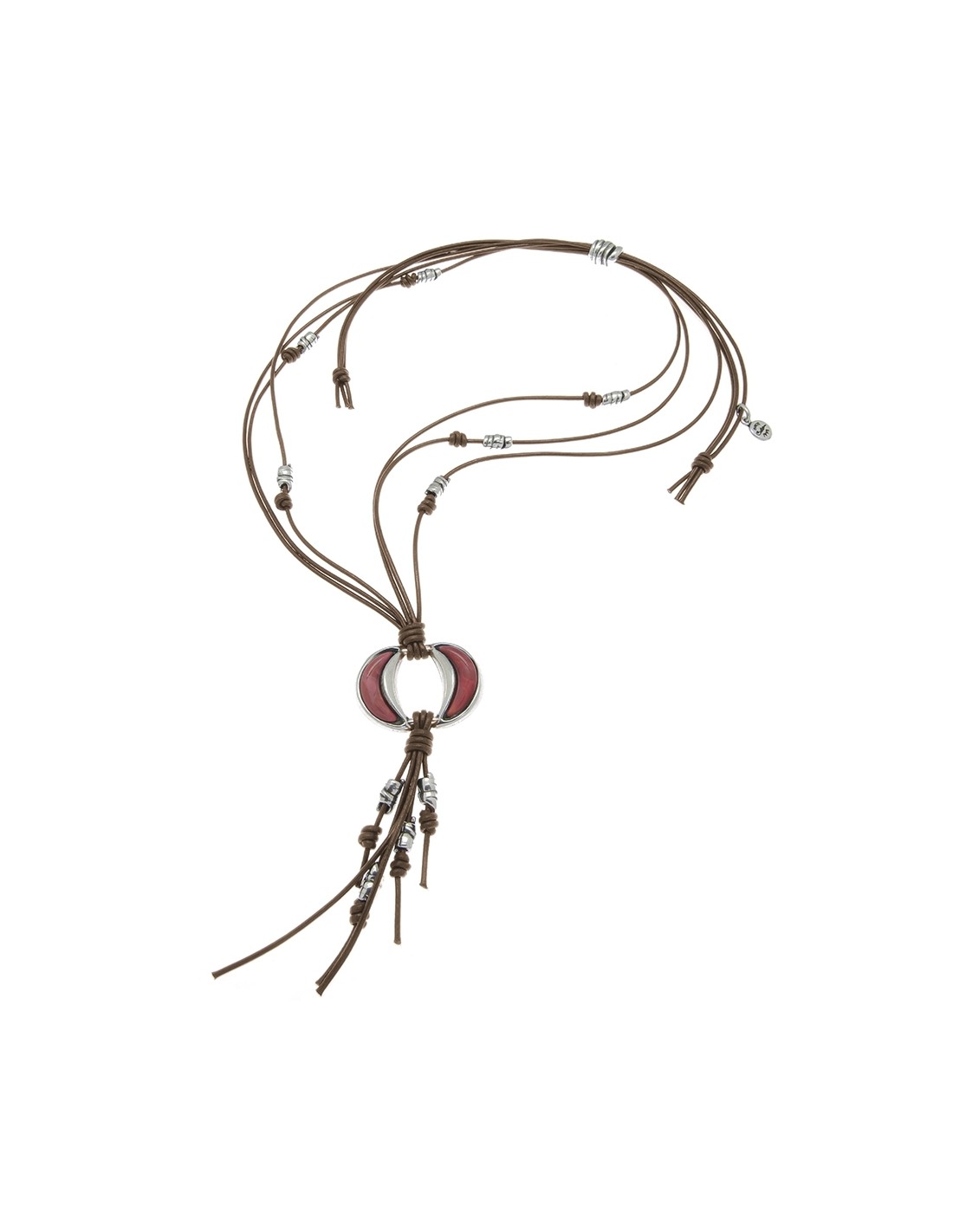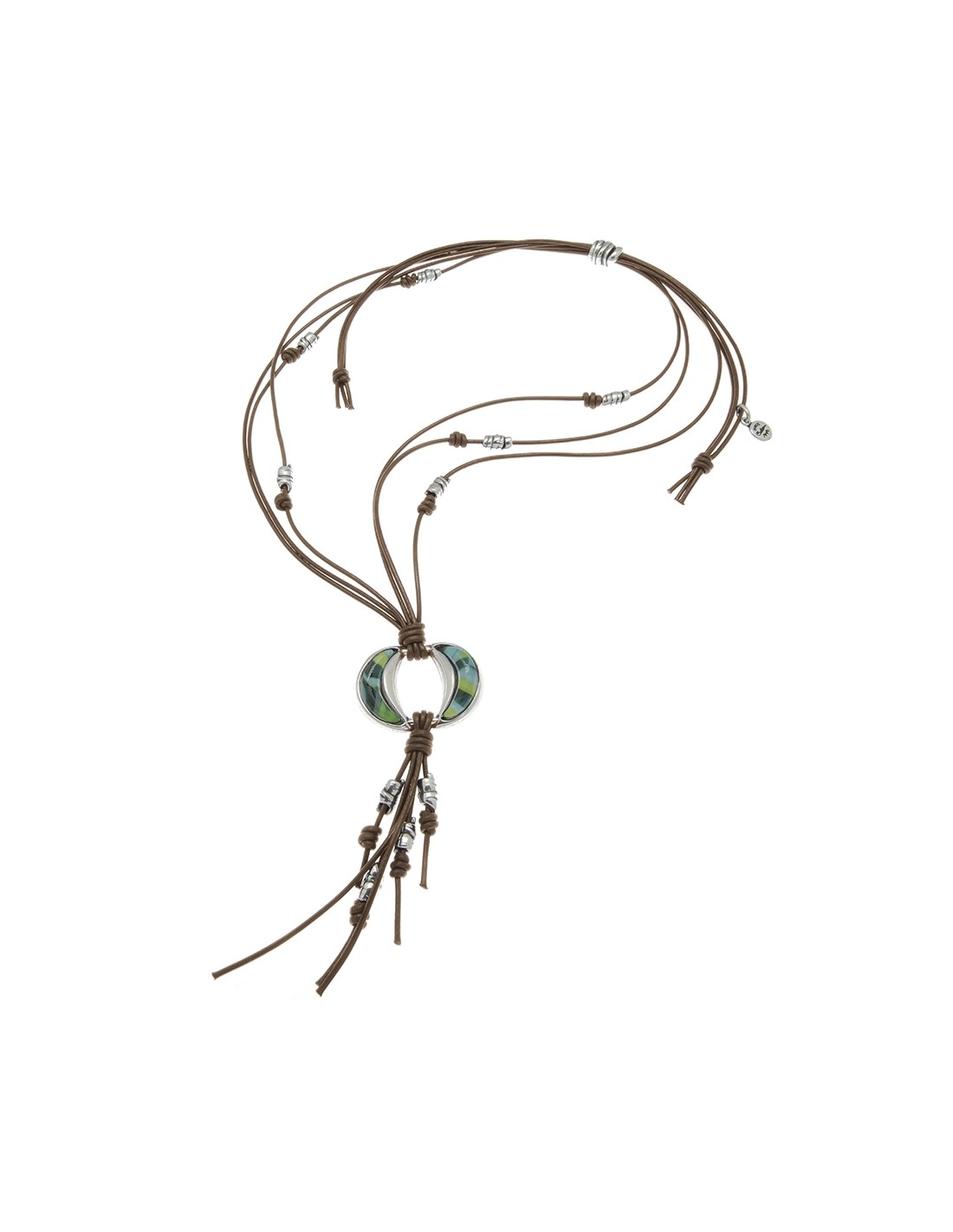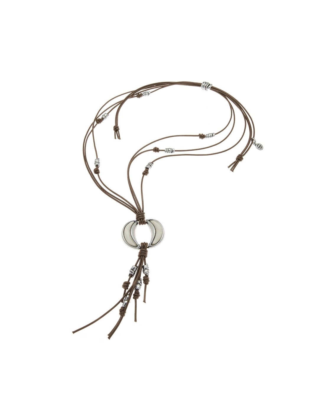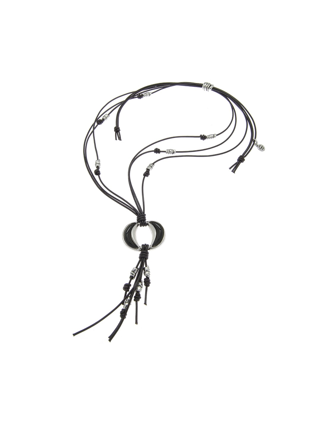 Collar luna largo en tiras de cuero con piezas de metal y original colgante central doble luna de metal bañado en plata, y también combinado con cristal artesanal de Murano. Destaca el innovador diseño del colgante de esta pieza. Esta joya ha sido realizada por Ciclón de manera totalmente artesanal en nuestras instalaciones de España.