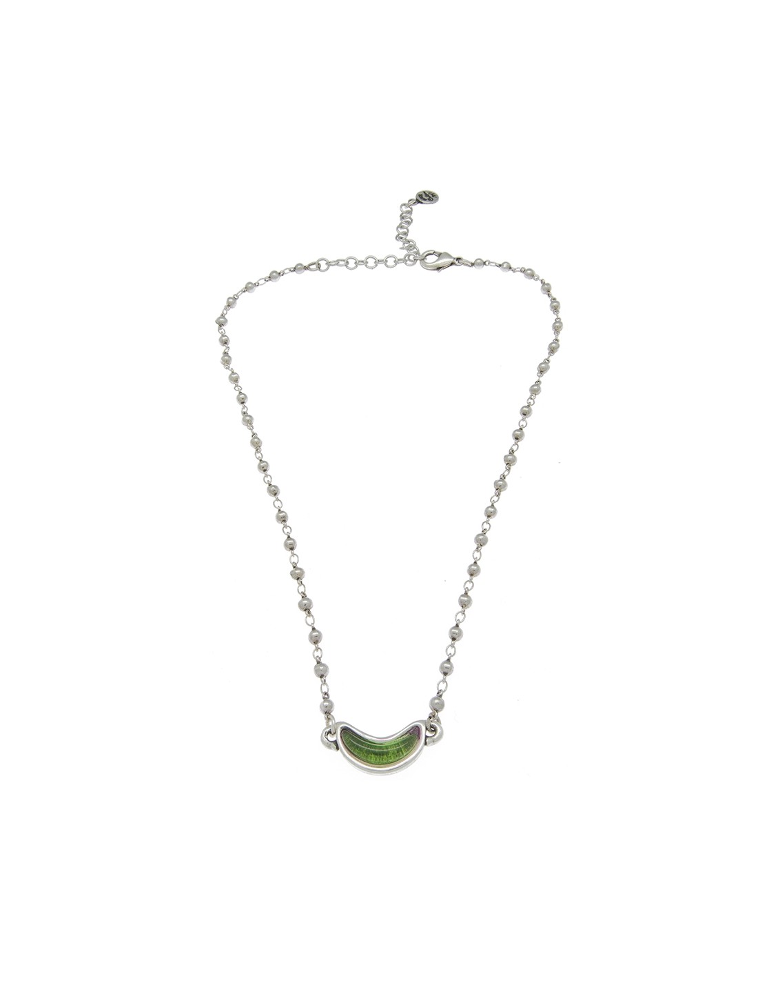 Collar corto con colgante de metal bañado en plata, original pieza central en forma de luna combinada con cristal artesanal de Murano en varios tonos. Destaca el innovador diseño del colgante de esta pieza. Esta joya ha sido realizada por Ciclón de manera totalmente artesanal en nuestras instalaciones de España. Nuestros controles de calidad en componentes y baños garantizan todas nuestras piezas durante 2 años