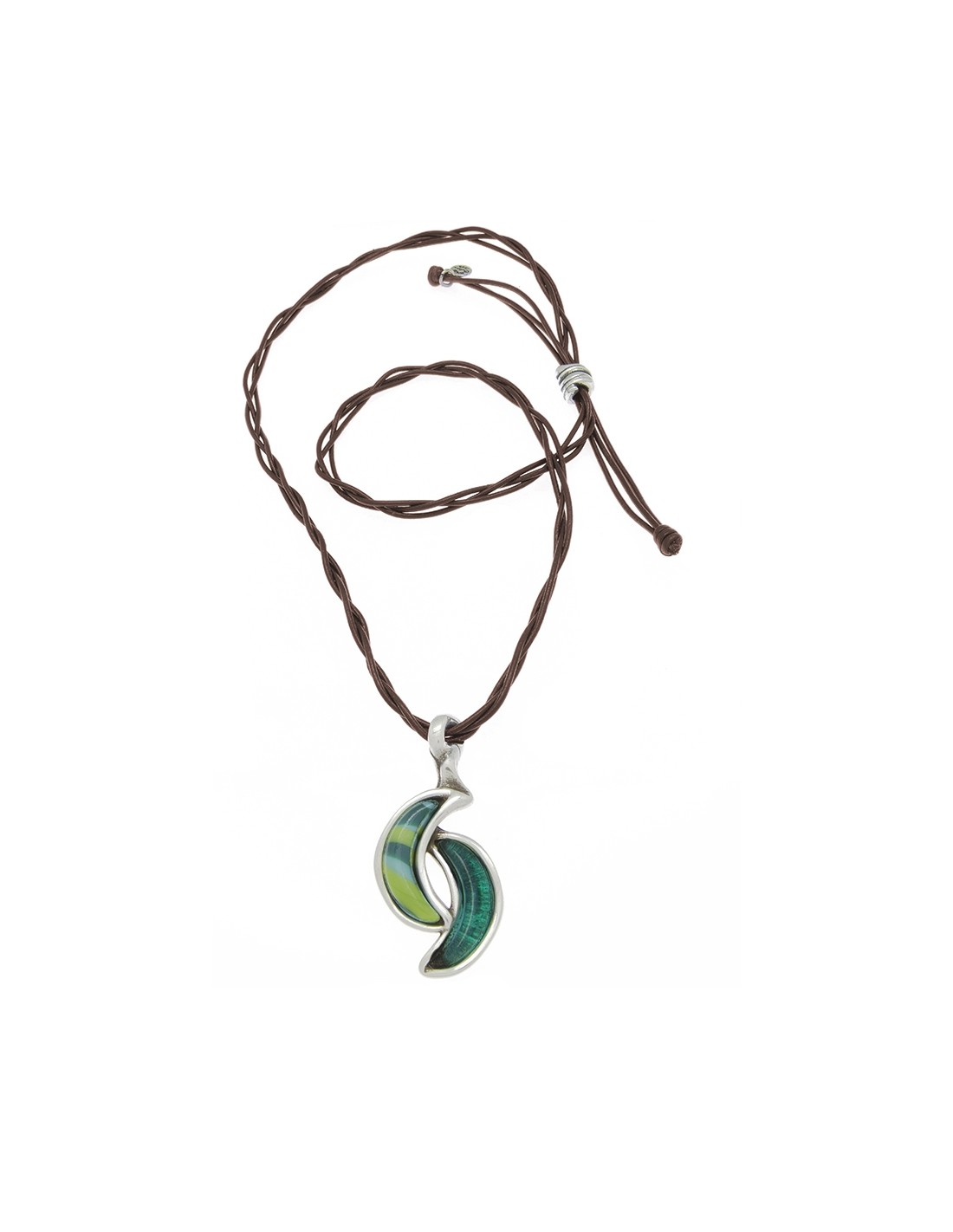 Collar largo de cuero marrón trenzado con original colgante central de la colección Luna en plata o combinado con cristal artesanal de Murano. Una pieza artesanal y original elaborada en España por Ciclón. Nuestros controles de calidad en componentes y baños garantizan todas nuestras piezas durante 2 años