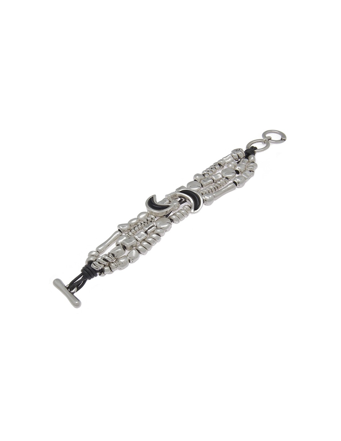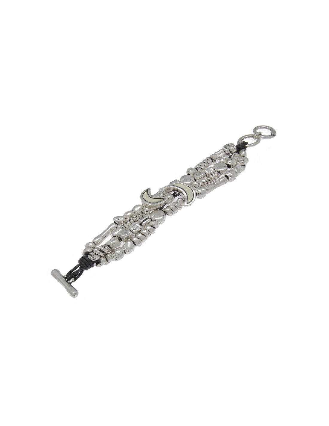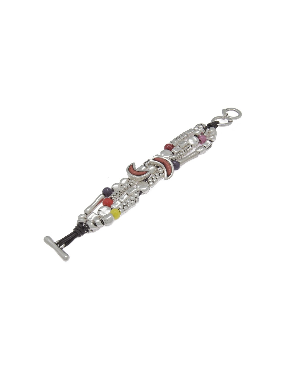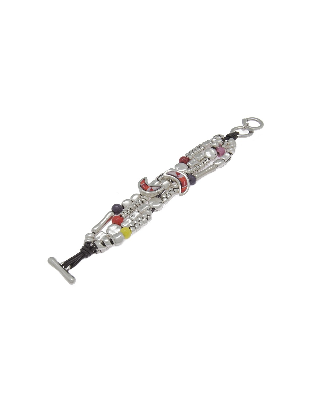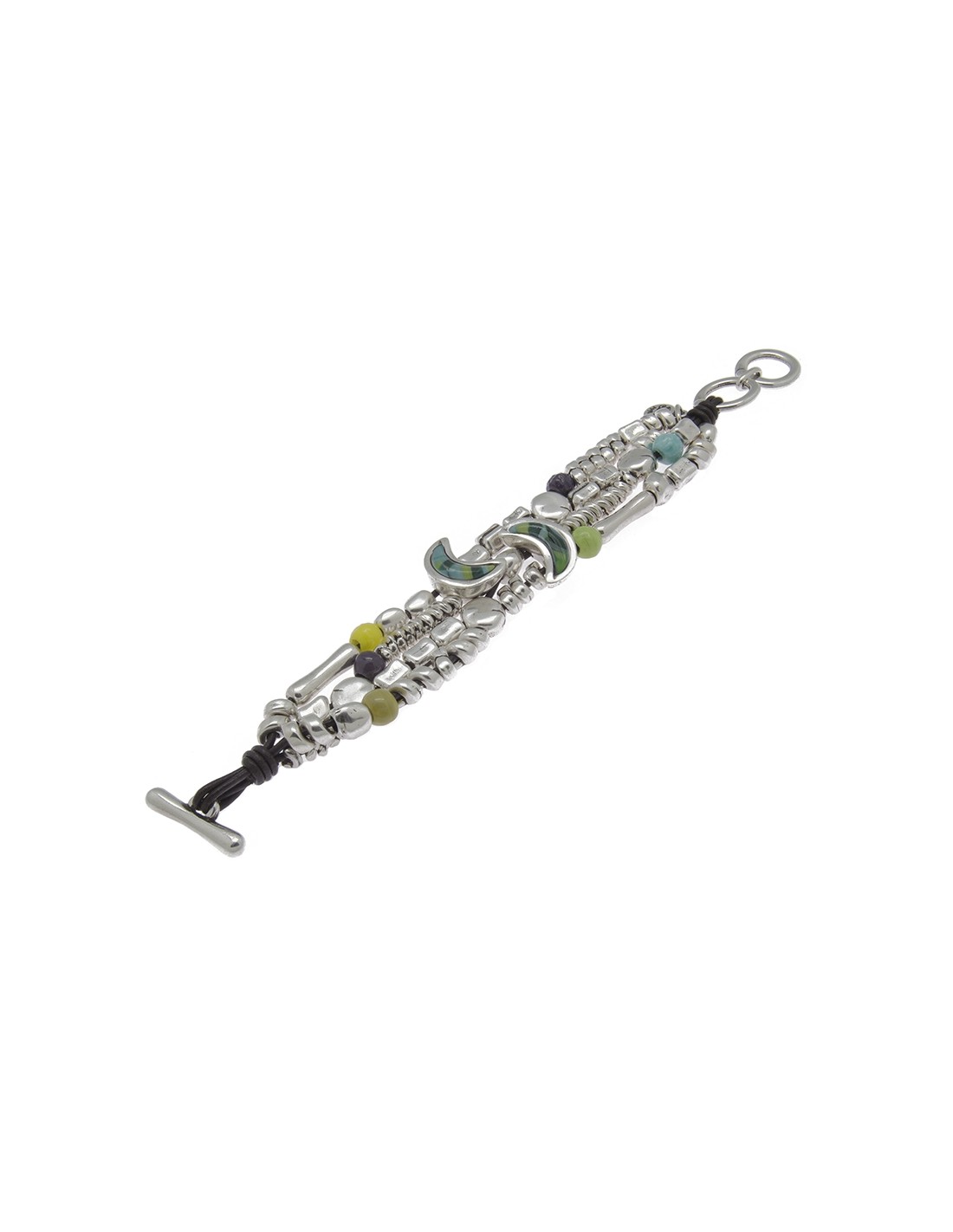 Pulsera en metal bañado en plata y cuero formada con piezas metálicas bañados en plata de diferentes motivos, también con cristales artesanales de Murano en varios tonos, novedad en tricolor. Un original diseño con toda la personalidad de Ciclón hecho de manera artesanal en nuestras instalaciones de Madrid.
