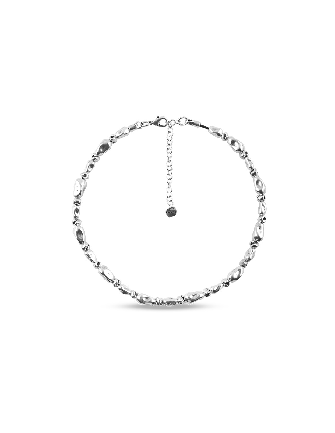 Collar corto, con piezas de metal bañadas en plata. Una creación original y elegante de las piezas que lo componen, una joya creada por Ciclón, y realizada de forma artesanal en España. Nuestros controles de calidad en componentes y baños garantizan todas nuestras piezas durante 2 años