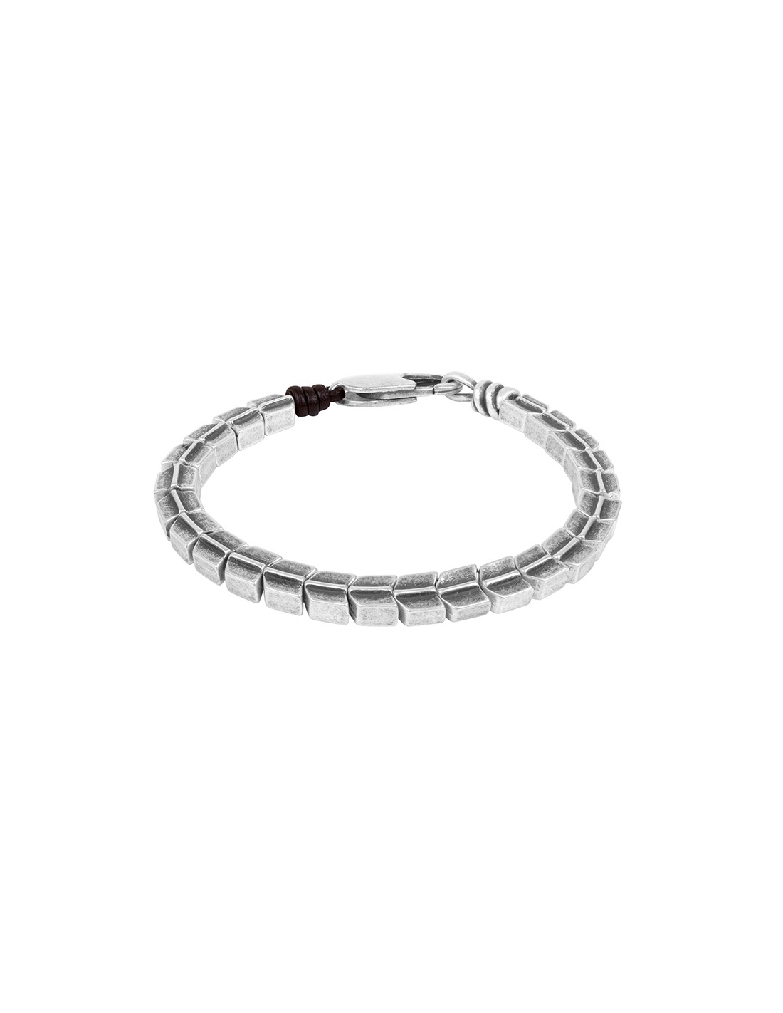 Pulsera con piezas de metal bañadas en plata montada sobre cuero con original cierre metálico bañado en plata, un innovador diseño con toda la personalidad de Ciclón, hecho de manera artesanal 100% en nuestras instalaciones de Madrid.