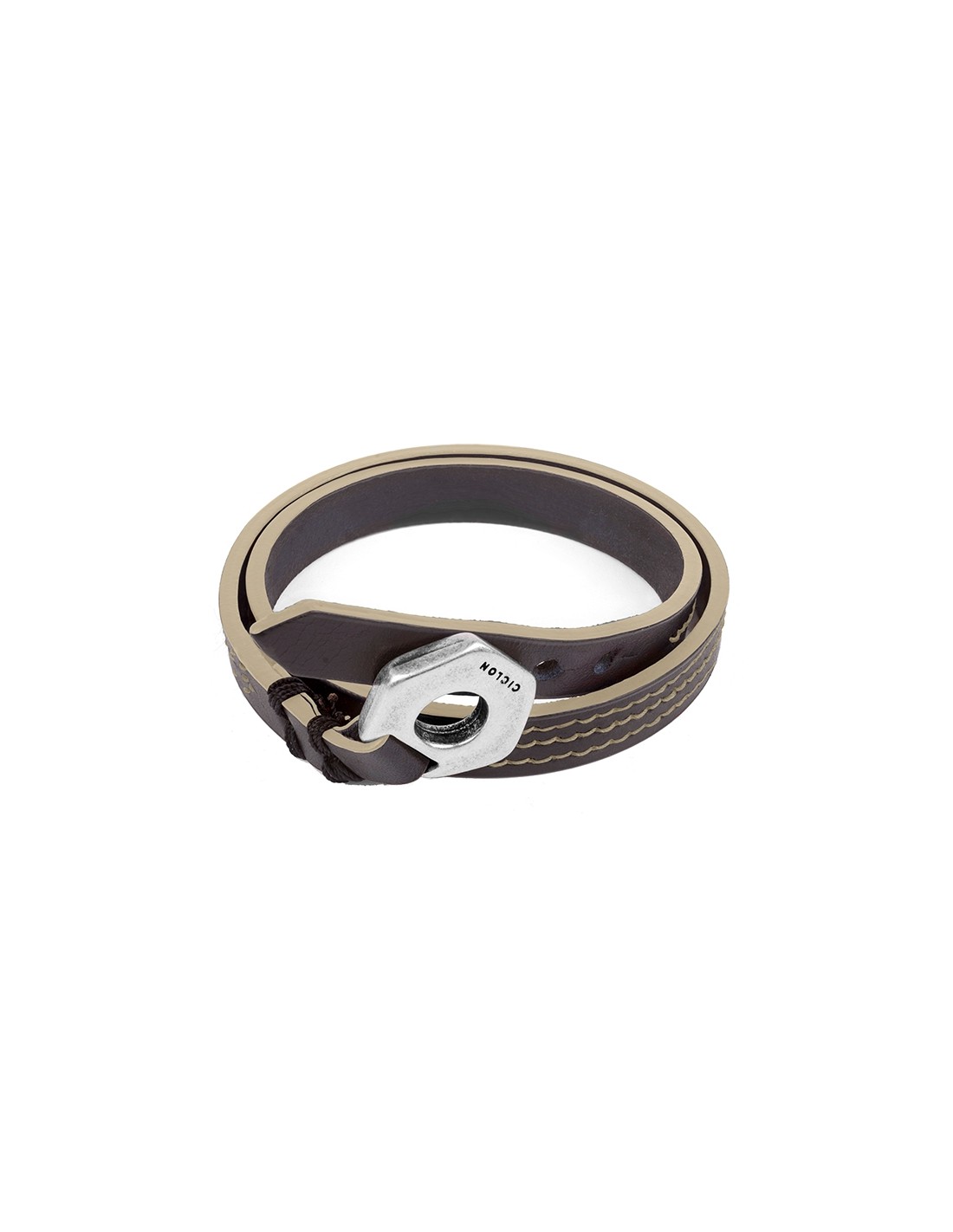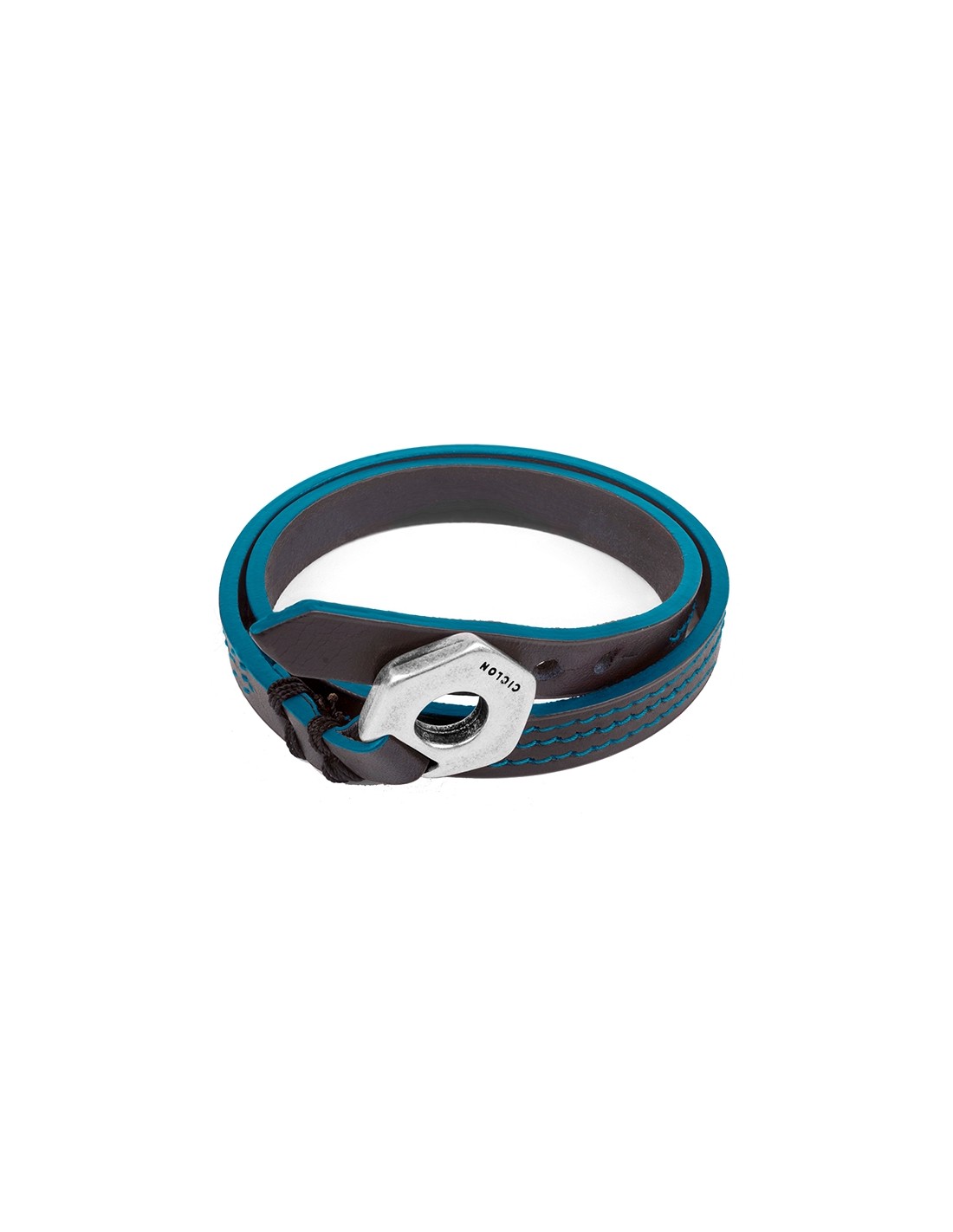Pulsera en cuero de primera calidad en doble vuelta, con original cierre en metal bañado en plata, un diseño sencillo pero con toda la personalidad de Ciclón, hecho de manera artesanal 100% en nuestras instalaciones de Madrid.