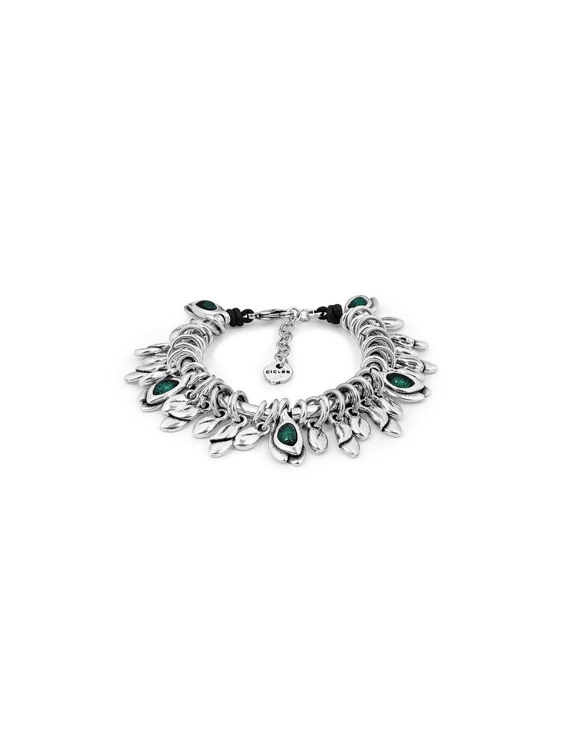Pulsera de metal bañada en plata montada sobre cuero, con diferentes motivos en combinación con cristald e Murano, diseñada para colección BOTANIC SENSE. Un original e innovador diseño con toda la personalidad de Ciclón hecho de manera artesanal 100% en nuestras instalaciones de Madrid.
