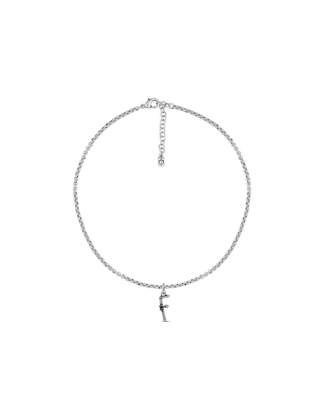 Collar de 40cm con cadena de metal bañada en plata y letra F de 2,4cm. El collar lleva una cadena que amplía 7cm la longitud.