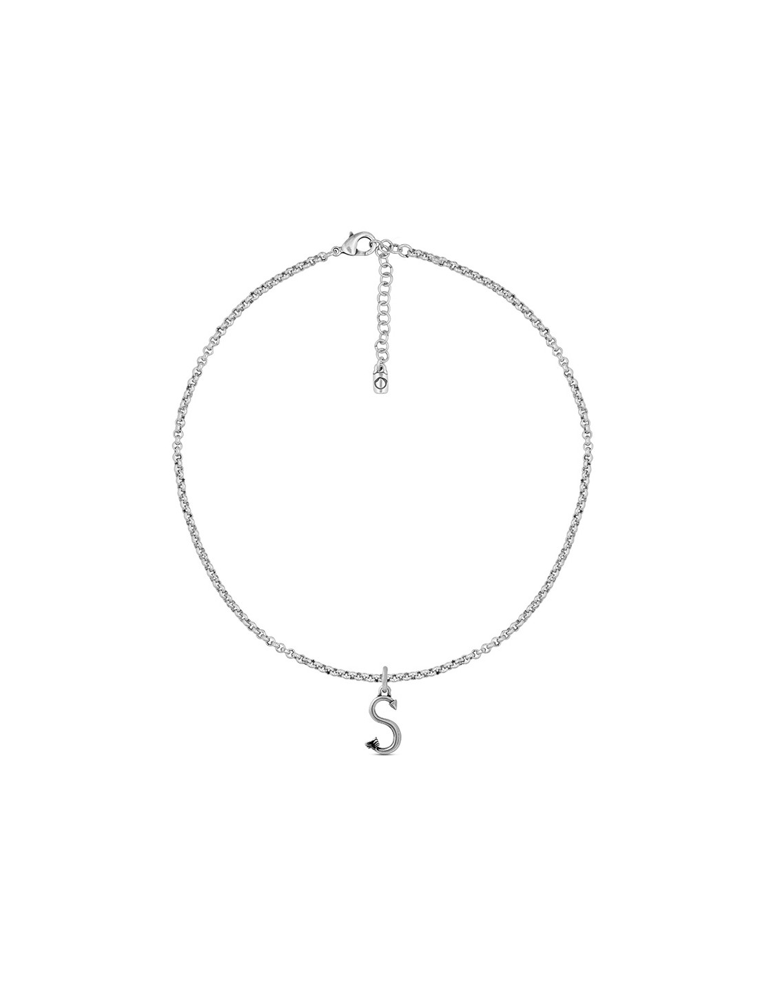 Collar de 40cm con cadena de metal bañada en plata y letra S de 2,4cm. El collar lleva una cadena que amplía 7cm la longitud.