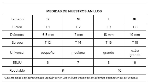 - Pulseras Rígidas: Talla 1 (S) de 63mm de diámetro y Talla 2 (M) de 66mm.